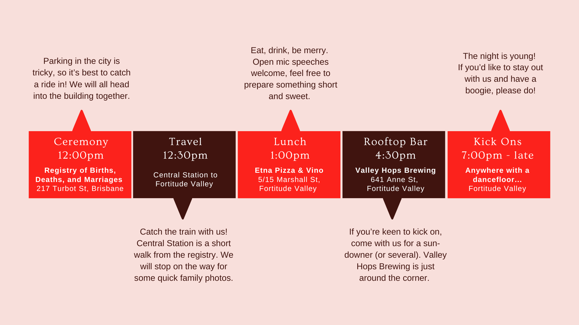 We’re opting for a low-fuss, fun-filled, celebration with our nearest and dearest (that’s you!). We love Brisbane, and it makes for a somewhat central location for our geographically dispersed loved ones.